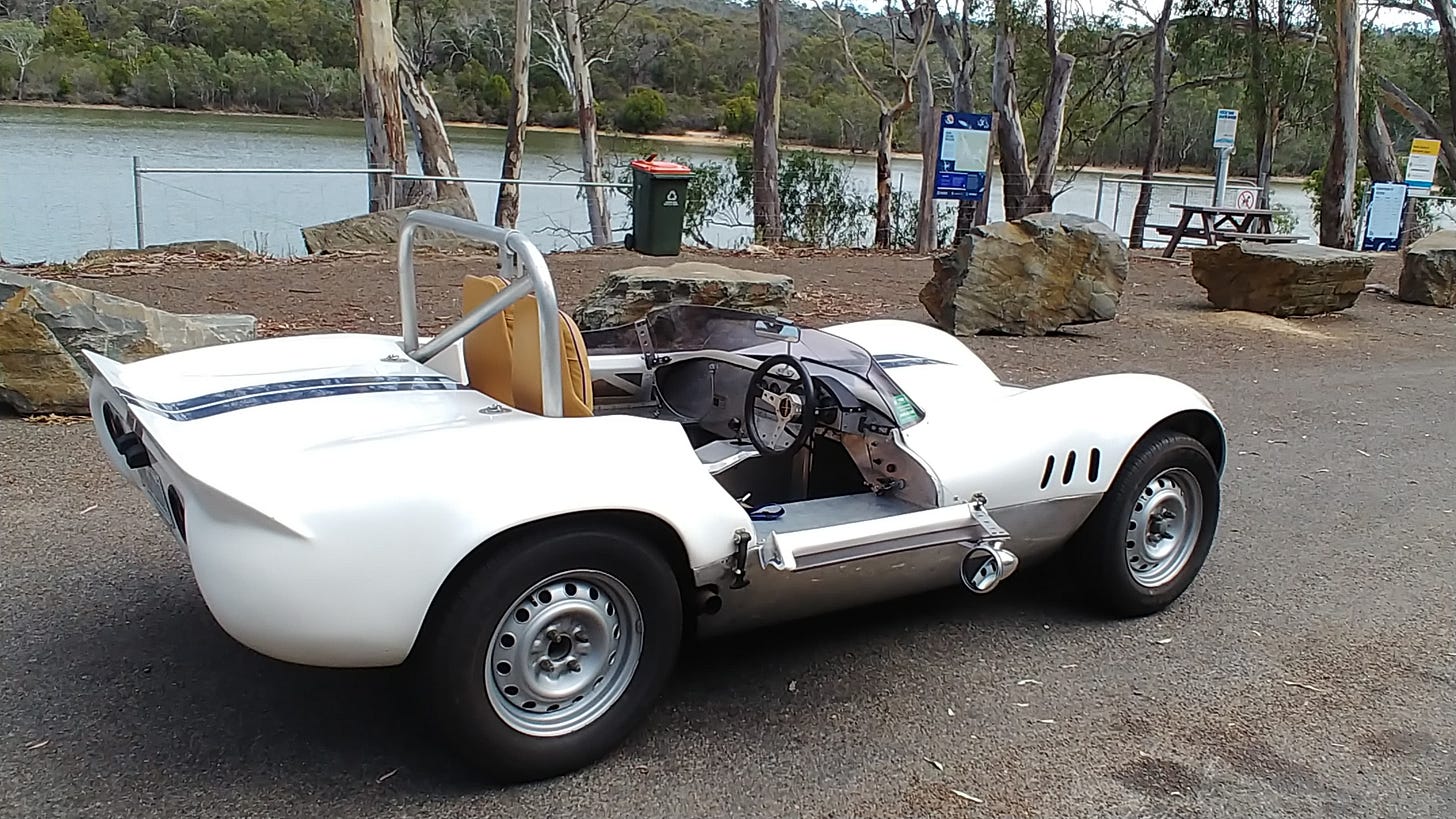 “Hi Jim, this may interest you another Aussie mark, my 1963 Bolwell mark 4B (it now has modern seats), basically a seven with a streamlined body, 1438 Fiat twin cam power.”
